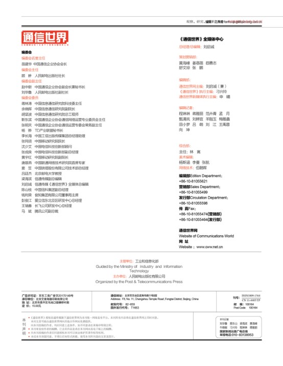 《通信世界》每月5、15、25日出版發行,全年共34期,開本為16開,共計44P,全彩四色印刷。《通信世界》紙質發行、網絡發行、數據庫發行共覆蓋47萬人。