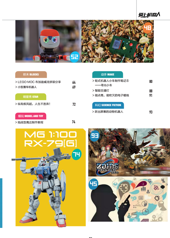 簡(jiǎn)介:《愛(ài)上機(jī)器人》雜志自創(chuàng)刊以來(lái),本著普及科學(xué)知識(shí)、傳播科學(xué)思想和科學(xué)方法、弘揚(yáng)科學(xué)精神的思想,以“激發(fā)探索興趣,掌握科技之鑰”為辦刊宗旨,將機(jī)器人領(lǐng)域的核心技術(shù)、研究進(jìn)展、應(yīng)用熱點(diǎn)、發(fā)展趨勢(shì)、熱門(mén)產(chǎn)品、重大賽事、藝術(shù)設(shè)計(jì)等內(nèi)容囊括于其中,意在深入貫徹STEAM教育,幫助青少年全方位發(fā)展。作者團(tuán)隊(duì)中,有來(lái)自國(guó)家級(jí)研究機(jī)構(gòu)的專(zhuān)家與學(xué)者,有來(lái)自小學(xué)、初中、高中、大學(xué)的眾多優(yōu)秀教師,有來(lái)自創(chuàng)客空間的創(chuàng)新者,還有人工智能與機(jī)器人領(lǐng)域初露鋒芒的小愛(ài)好者,意在緊貼讀者需求。雜志緊跟國(guó)家科普戰(zhàn)略以及科技發(fā)展動(dòng)態(tài),展現(xiàn)強(qiáng)國(guó)風(fēng)采,培養(yǎng)青少年的愛(ài)國(guó)主義情懷及民族自信。雜志整體將傳統(tǒng)媒體與新興媒體有效結(jié)合,為青少年帶去全面、豐富的機(jī)器人前沿信息、科普知識(shí),讓青少年緊跟時(shí)代發(fā)展的步伐,了解過(guò)去、掌控現(xiàn)在、放眼未來(lái)。