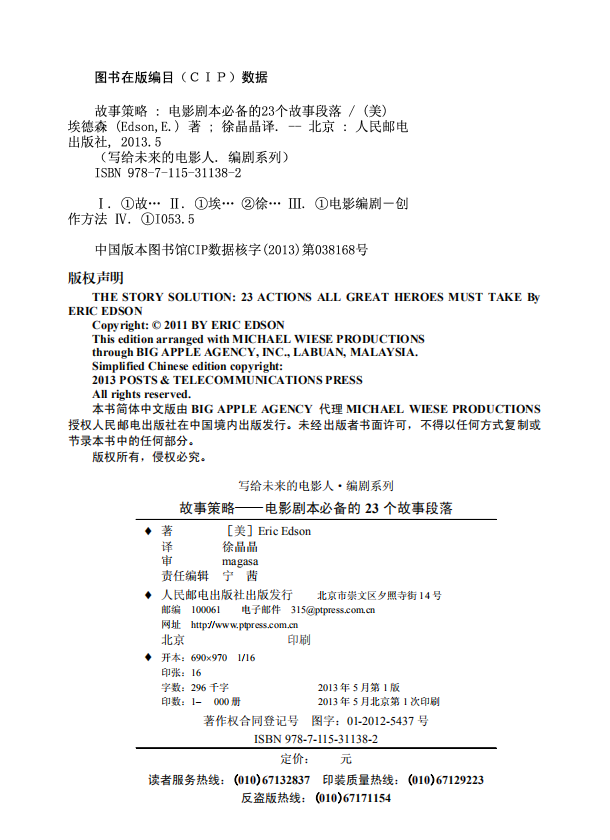 不管你是剛開始寫故事還是你已經有了一些劇本或小說的創作經歷,本書都將為你提供一個創建強有力的電影故事的全新方法,這將使讀者、代理人、制片人和觀眾都為之入迷。美國資深編劇和大學教授埃里克•埃德森(Eric Edson)揭示了在任何一個成功的電影劇本中都會用到的23個環環相扣的段落,以此創建動態且真實的主人公和吸引人的、情感注入的情節。