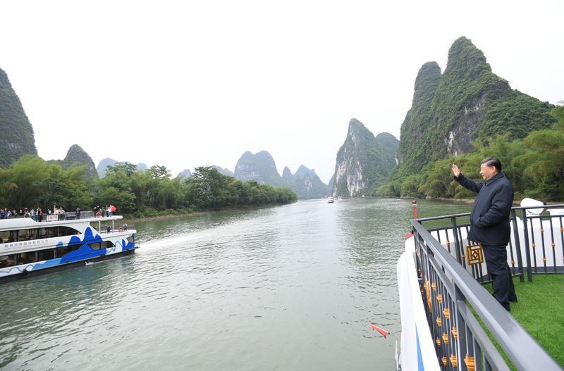 近年來,桂林市大力推進漓江“治亂、治水、治山、治本”,改善了漓江生態環境。25日下午,習近平來到桂林市陽朔縣漓江楊堤碼頭,聽取漓江流域綜合治理、生態保護等情況匯報,并乘船考察漓江陽朔段。他強調,要堅持山水林田湖草沙系統治理,堅持正確的生態觀、發展觀,敬畏自然、順應自然、保護自然,上下同心、齊抓共管,把保持山水生態的原真性和完整性作為一項重要工作,深入推進生態修復和環境污染治理,杜絕濫采亂挖,推動流域生態環境持續改善、生態系統持續優化、整體功能持續提升。