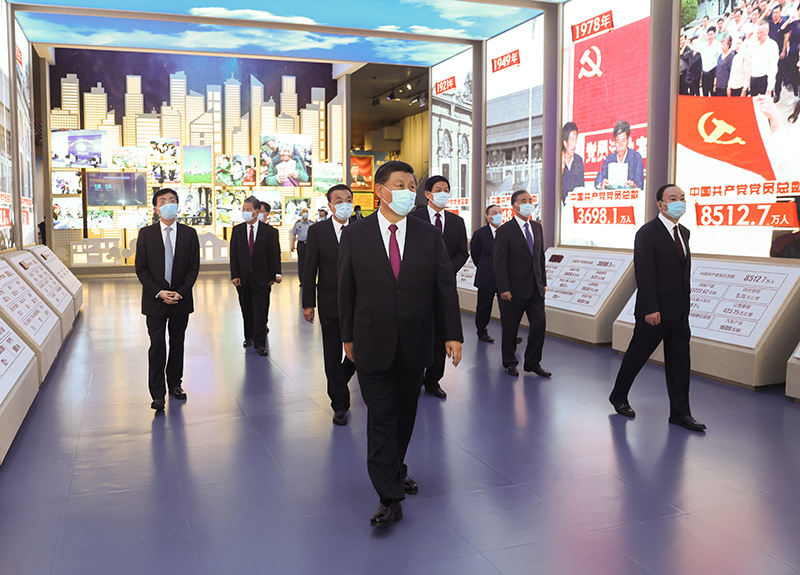 新近落成的中國(guó)共產(chǎn)黨歷史展覽館巍然矗立,氣勢(shì)恢宏。下午3時(shí)20分許,習(xí)近平等黨和國(guó)家領(lǐng)導(dǎo)同志來到這里,步入展廳參觀展覽。展覽以“不忘初心、牢記使命”為主題,精心設(shè)計(jì)了“建立中國(guó)共產(chǎn)黨 奪取新民主主義革命偉大勝利”、“成立中華人民共和國(guó) 進(jìn)行社會(huì)主義革命和建設(shè)”、“實(shí)行改革開放 開創(chuàng)和發(fā)展中國(guó)特色社會(huì)主義”、“推進(jìn)中國(guó)特色社會(huì)主義進(jìn)入新時(shí)代 全面建成小康社會(huì) 開啟全面建設(shè)社會(huì)主義現(xiàn)代化國(guó)家新征程”4個(gè)部分,通過2600余幅圖片、3500多件套文物實(shí)物,第一次全方位、全過程、全景式、史詩(shī)般展現(xiàn)中國(guó)共產(chǎn)黨波瀾壯闊的百年歷程,濃墨重彩地反映黨的不懈奮斗史、不怕犧牲史、理論探索史、為民造福史、自身建設(shè)史,使人們深刻認(rèn)識(shí)到紅色政權(quán)來之不易、新中國(guó)來之不易、中國(guó)特色社會(huì)主義來之不易,深刻認(rèn)識(shí)到中國(guó)共產(chǎn)黨為什么能、馬克思主義為什么行、中國(guó)特色社會(huì)主義為什么好。